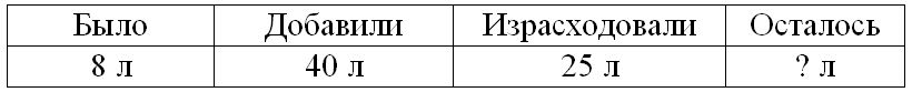 Краткое условие: В бензобаке машины было 8 л бензина. При заправке машины добавили 40 л бензина. За день израсходовали 25 л бензина.