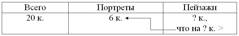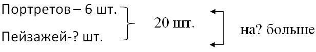 Краткое условие: В зале музея выставили 20 картин, из них 6 портретов, остальные — пейзажи. На сколь¬ко больше выставили пейзажей, чем портретов? Начерти, какой может быть тень на стене от картины с семейным портретом.