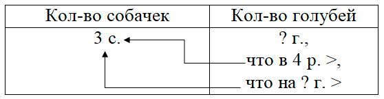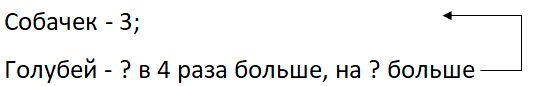 Краткое условие: В цирковом представлении участвовали 3 собачки, а голубей было в 4 раза больше. На сколько больше было голубей, чем собачек?