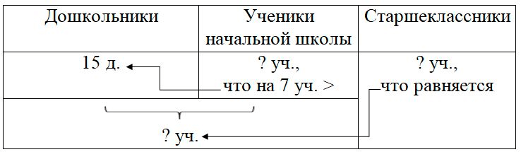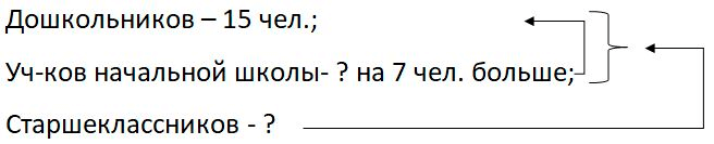 Краткое условие: В хоре «Мисолька» 15 дошкольников, учеников начальной школы на 7 больше, а старшеклассников столько, сколько дошкольников и учеников начальной школы вместе. Сколько ... ?