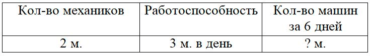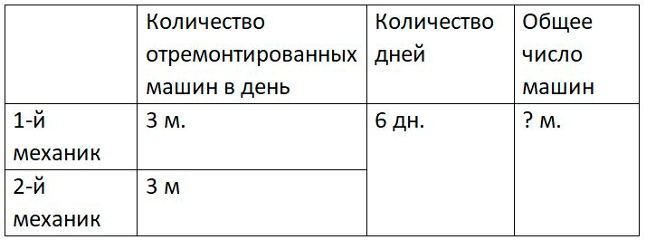 Краткое условие: В автомастерской работали 2 механика. В день каждый из них ремонтировал по 3 машины. Сколько машин они отремонтировали за 6 дней?