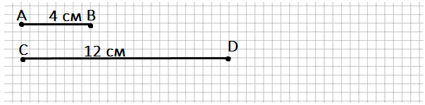 Краткое условие: Начерти два отрезка так, чтобы длина одного была 4 см, а длина другого — в 3 раза больше. Обозначь отрезки буквами и узнай, на сколько сантиметров один из них короче другого.