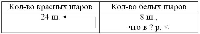 Краткое условие: Укажи ответ к задаче. У продавца было 24 красных шара и 8 белых. Во сколько раз белых шаров было меньше, чем красных?