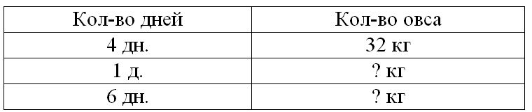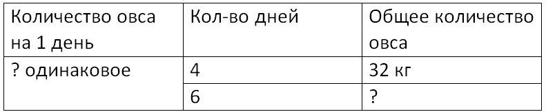 Краткое условие: На 4 дня лошади нужно 32 кг овса. (Ежедневная норма выдачи овса одна и та же.) Сколько килограммов овса нужно лошади на 6 дней, если норма выдачи в день не изменится?
