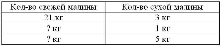 Краткое условие: Из 21 кг свежей малины получается 3 кг сухой. Сколько взяли свежей малины, если получили 5 кг сухой?