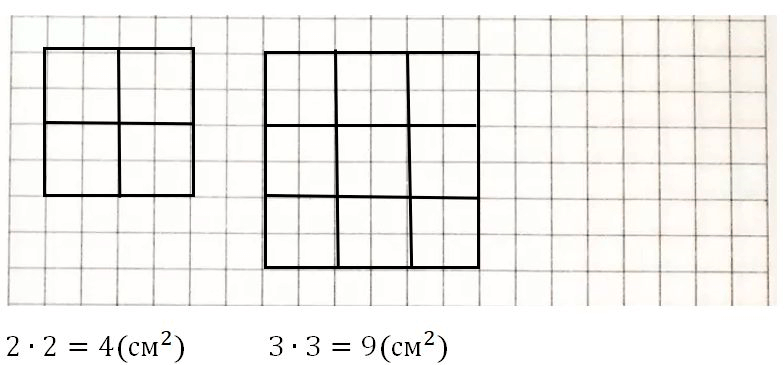 Краткое условие: Начерти два квадрата: один со стороной 2 см, другой со стороной 3 см. Разбей каждый квадрат на квадратные сантиметры и найди его площадь.
