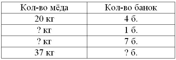 Краткое условие: В 4 банки поровну разлили 20 кг мёда. Хватит ли 7 банок, чтобы так же разлить 37 кг мёда? Если нет, то определи, сколько килограммов мёда останется.