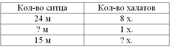 Краткое условие: Из 24 м ситца сшили 8 одинаковых халатов. Сколько таких халатов можно сшить из 15 м ситца?