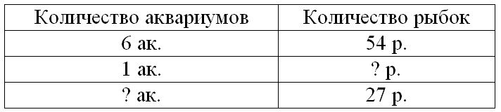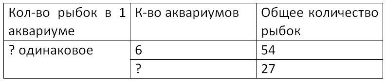 Краткое условие: В 6 аквариумах 54 рыбки, поровну в каждом. Сколько аквариумов занимают 27 рыбок?
