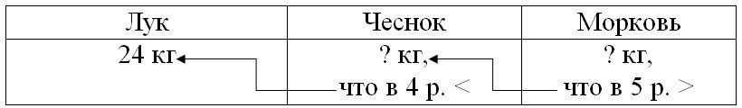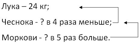 Краткое условие: 1) В огороде собрали 24 кг лука, чеснока в 4 раза меньше, чем лука, а моркови в 5 раз больше, чем чеснока. Сколько килограммов моркови собрали? 2) Составь задачу по выражению (15 : 3) * 2.