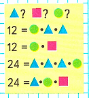 2) Подумаем, какое число прячется под треугольником, квадратом и кругом при условии, что одинаковые фигуры обозначают одинаковые числа:
