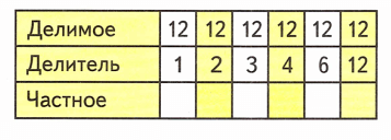 Краткое условие: Заполни таблицу и проследи, как при одном и том же делимом менялся делитель и как — частное.