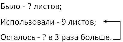 Краткое условие: После того как дети использовали 9 листов цветной бумаги для изготовления оригами, у них осталось в 3 раза больше листов, чем они израсходовали. Сколько листов бумаги было сначала?