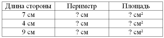Краткое условие: Найди площадь и периметр квадрата, если длина его стороны 7 см; 4 см; 9 см.