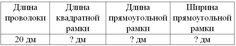 Краткое условие: Из куска проволоки длиной 20 дм сначала сделали квадратную рамку, а затем прямоугольную. Найди длину стороны квадратной рамки. Какой длины могут быть стороны прямоугольной рамки?