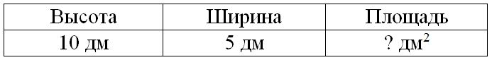 Краткое условие: Высота зеркала прямоугольной формы 10 дм, а ширина 5 дм. Чему равна площадь зеркала?