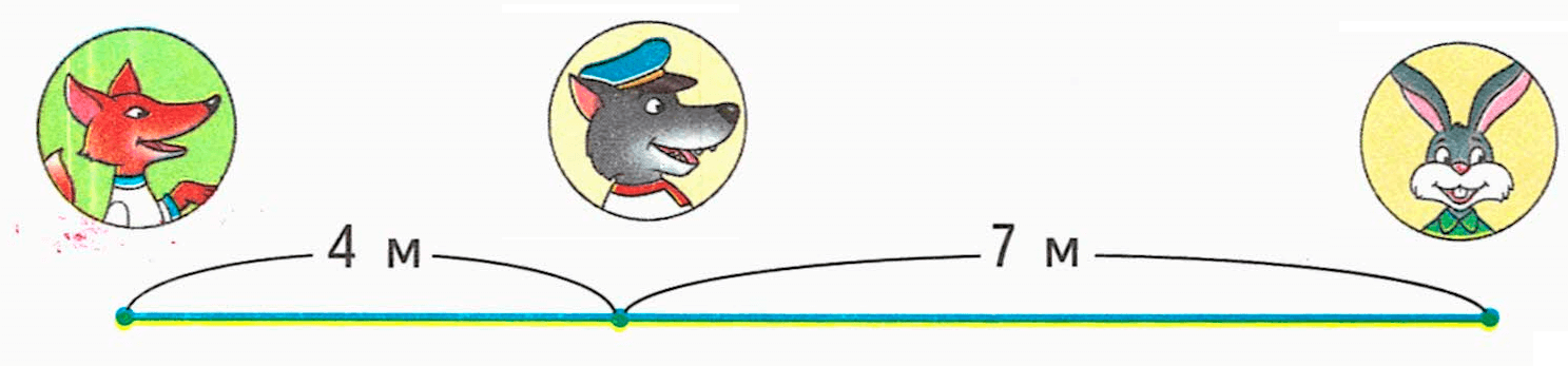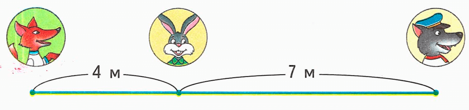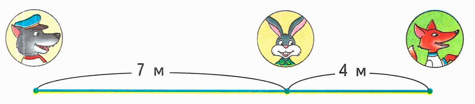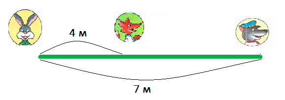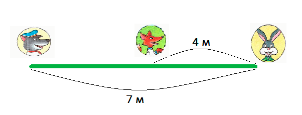7 - 4 = 3 (м) - расстояние между лисой и волком.