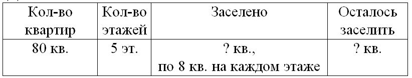 Краткое условие: В новом пятиэтажном доме 80 квартир. На каждом этаже заселили по 8 квартир. Сколько квартир осталось заселить?