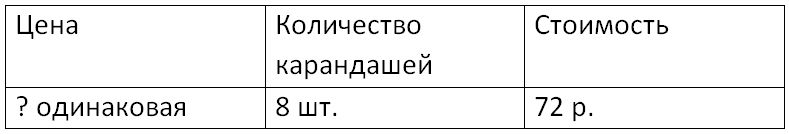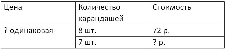 Краткое условие: 8 карандашей стоят 72 р. 1) Сколько стоят 7 таких карандашей? 2) Сколько таких карандашей можно купить на 20 р.? Сколько денег останется?