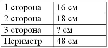 Краткое условие: Периметр треугольника 48 см. Длина одной его стороны 16 см, а другой — 18 см. Найди длину третьей стороны этого треугольника.