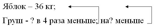 Краткое условие: В столовую привезли 36 кг яблок, а груш в 4 раза меньше. На сколько килограммов меньше привезли груш, чем яблок?