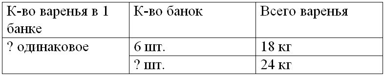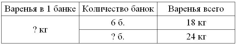 Краткое условие: 18 кг варенья разложили в 6 банок поровну. Сколько надо таких банок, чтобы разложить 24 кг варенья?