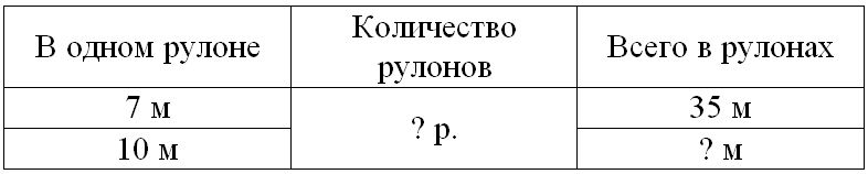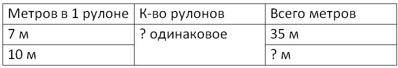Краткое условие: Купили 35 м обоев в рулонах, по 7 м в каждом, и столько же рулонов, по 10 м в каждом. Сколько метров обоев было в рулонах по 10 м?