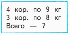 Краткое условие: В детский сад привезли 4 коробки конфет, по 9 кг в каждой, и 3 коробки печенья, по 8 кг в каждой. Сколько всего килограммов конфет и печенья привезли в детский сад? Рассмотри краткую запись задачи, составь по ней выражение для решения этой задачи. Дай ответ на вопрос задачи.