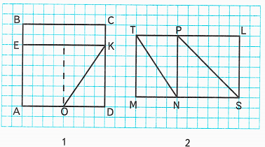 Краткое условие: 1) Сделай такой же чертёж в тетради и подумай, как можно узнать площадь каждой из фигур с общей стороной ОК (рис. 1); с общей стороной NP. 2) Узнай, площадь какой фигуры меньше: прямоугольника ВСКЕ или треугольника OKD — и на сколько квадратных сантиметров.