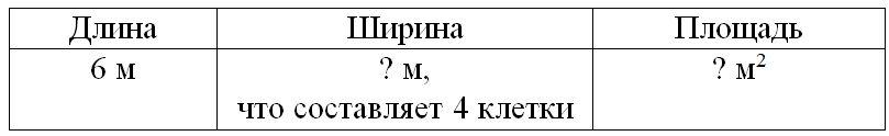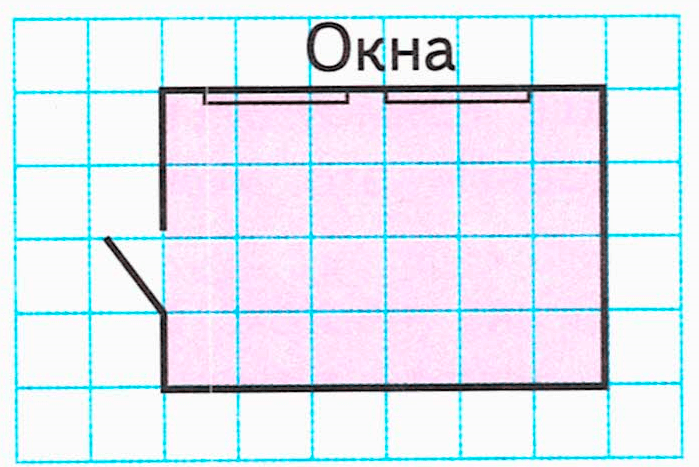 Краткое условие: На рисунке изображён план комнаты, на котором длина стороны одной клетки условно изображает 1 м. Длина комнаты на плане 6 клеток, значит, настоящая её длина 6 м. Найди ширину и вычисли площадь этой комнаты.