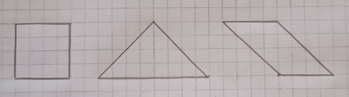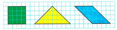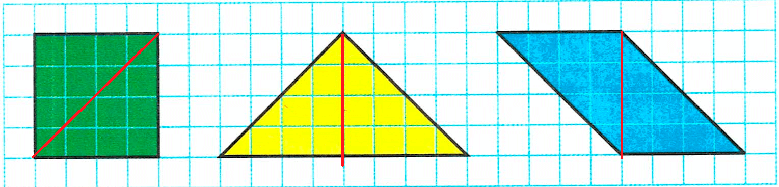 Краткое условие: Начерти в тетради такие фигуры. Проведи в каждой фигуре один отрезок так, чтобы стало видно, что все три фигуры имеют одинаковые площади. В каких фигурах проведённый отрезок будет осью симметрии фигуры?