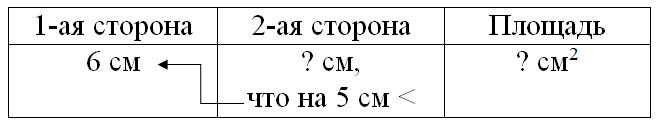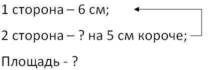 Краткое условие: Укажи площадь прямоугольника, у которого длина одной стороны 6 см, а вторая сторона на 5 см короче.