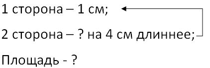 Краткое условие: Укажи площадь прямоугольника, у которого длина одной стороны 1 см, а вторая сторона на 4 см длиннее.