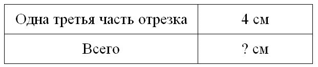Краткое условие: Длина одной третьей части отрезка равна 4 см. Узнай длину всего отрезка.