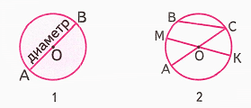 Краткое условие: Отрезок, который проходит через центр окружности (О) и соединяет две точки окружности (А и В), — это диаметр окружности (круга). Диаметры одной окружности (круга) равны. Почему? Назови диаметры окружности на рисунке. Возьми любой круг и убедись с помощью перегибания, что диаметр делит круг пополам, является его осью симметрии.