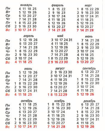 В январе 4 недели и 3 дня, в феврале – 4 недели, в марте – 4 недели и 3 дня, в апреле – 4 недели и 2 дня, в мае – 4 недели и 3 дня, в июне – 4 недели и 2 дня, в июле - 4 недели и 3 дня, в августе - 4 недели и 3 дня, в сентябре - 4 недели и 2 дня, в октябре - 4 недели и 3 дня, в ноябре - 4 недели и 2 дня, в декабре - 4 недели и 3 дня.