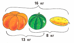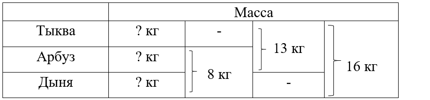 Краткое условие: Масса тыквы, арбуза и дыни — 16 кг, тыквы и арбуза — 13 кг, арбуза и дыни — 8 кг. Найди массу каждого отдельно.