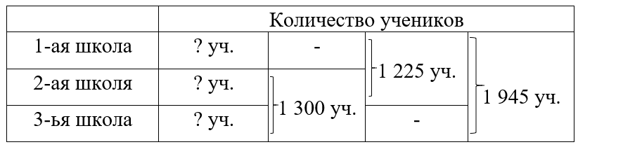 Краткое условие: В трёх школах 1 945 учеников. В первой и второй — 1 225, во второй и третьей — 1 300. Сколько учеников в каждой школе? Реши и проверь.