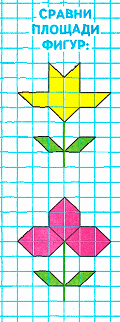 1. Первая фигура состоит из 6 полных клеток и 10 половинок. Так как 10 : 2 = 5, то 10 половинок соответствуют 5 полным клеткам. Значит, 6 + 5 = 11. Следовательно, площадь первой фигуры равна 11 клеткам.
