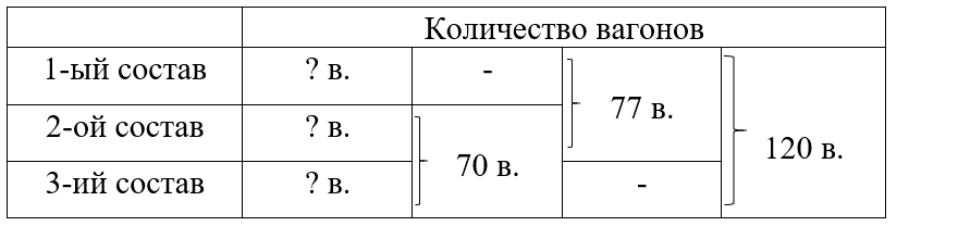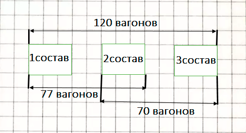Краткое условие: В трёх составах 120 вагонов. В первом и втором — 77, во втором и третьем — 70. Сколько вагонов в каждом составе? Сделай чертёж и реши.