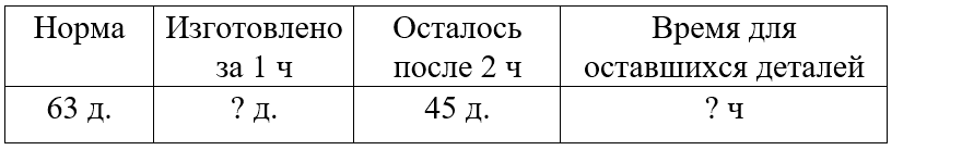 Краткое условие: Рабочему за день нужно изготовить 63 детали. Через 2 ч осталось сделать 45 деталей. За сколько часов он изготовит оставшиеся детали при той же выработке?