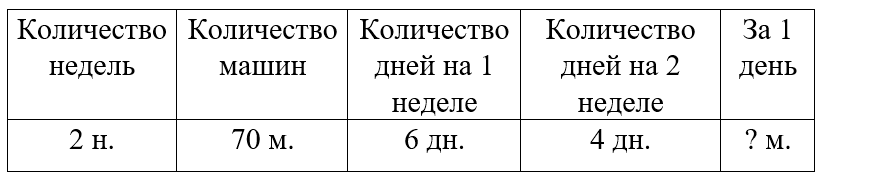 Краткое условие: Рабочие за две недели отремонтировали 70 машин, работая 6 дней в первую неделю и 4 дня во вторую, ежедневно ремонтируя одинаковое число машин. Сколько машин ремонтировали в день?