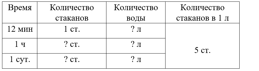 Краткое условие: Из крана капают 2 капли в секунду, за 12 мин наполняется стакан. Сколько литров воды вытечет за час? За сутки?