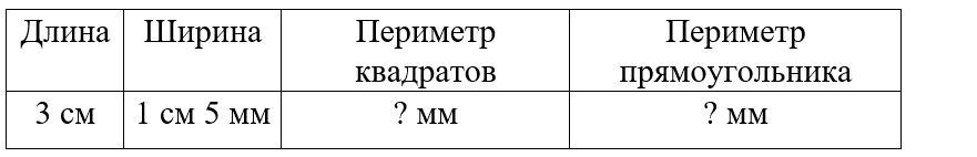 Краткое условие: Из двух одинаковых квадратов составили прямоугольник 3 см на 1 см 5 мм. Сделай чертёж, вырази стороны в мм, вычисли периметры прямоугольника и квадрата.