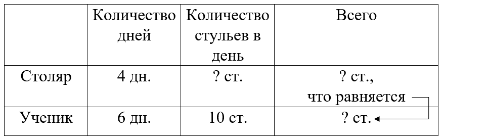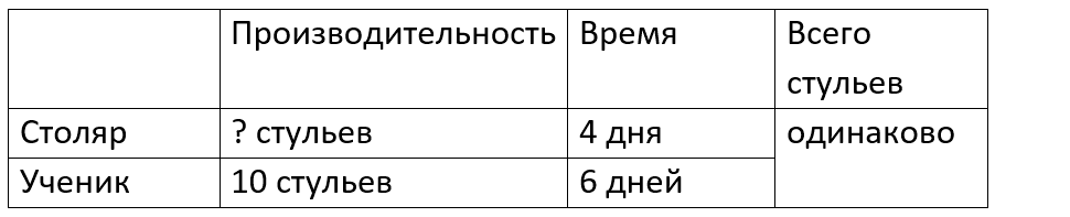 Краткое условие: Столяр и ученик ремонтировали стулья. Ученик за 6 дней ремонтировал по 10 стульев в день, а столяр сделал ту же работу за 4 дня. Сколько стульев в день ремонтировал столяр?
