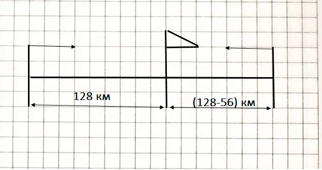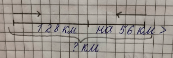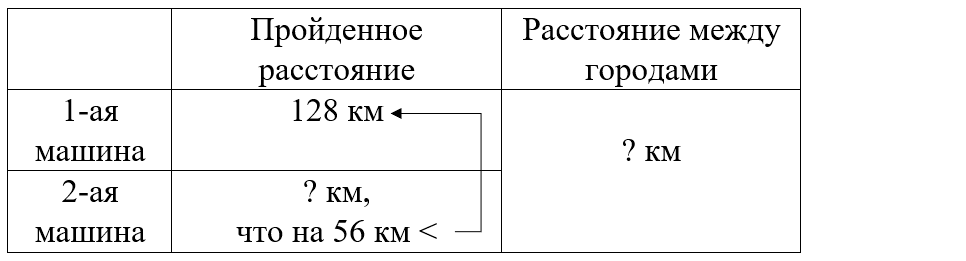 Краткое условие: Из двух городов навстречу вышли две машины. Одна прошла до встречи 128 км, другая — на 56 км меньше. Сделай чертёж и узнай расстояние между городами.