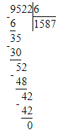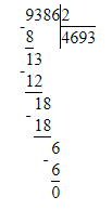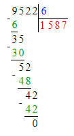 1. Делю тысячи. 9 тысяч – это первое неполное делимое. Значит, в частном получатся тысячи и в записи частного будет 4 цифры. Неполное частное чисел 9 и 6 равняется 1 – столько тысяч будет в частном. Умножу 1 на 6, получу 6 – столько тысяч разделили. Вычту 6 из 9, получу 3 – столько тысяч осталось разделить. Сравню остаток с делителем: число оставшихся тысяч меньше, чем 6.