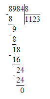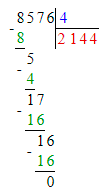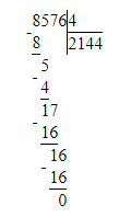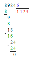1. Делю тысячи. 8 тысяч – это первое неполное делимое. Значит, в частном получатся тысячи и в записи частного будет 4 цифры. Частное чисел 8 и 4 равняется 2 – столько тысяч будет в частном. Умножу 2 на 4, получу 8 – столько тысяч разделили. Вычту 8 из 8, получу 0 – тысячи разделили все.