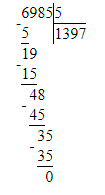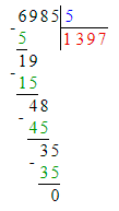 1. Делю тысячи. 6 тысяч – это первое неполное делимое. Значит, в частном получатся тысячи и в записи частного будет 4 цифры. Неполное частное чисел 6 и 5 равняется 1 – столько тысяч будет в частном. Умножу 1 на 5, получу 5 – столько тысяч разделили. Вычту 5 из 6, получу 1 – столько тысяч осталось разделить. Сравню остаток с делителем: число оставшихся тысяч меньше, чем 5.