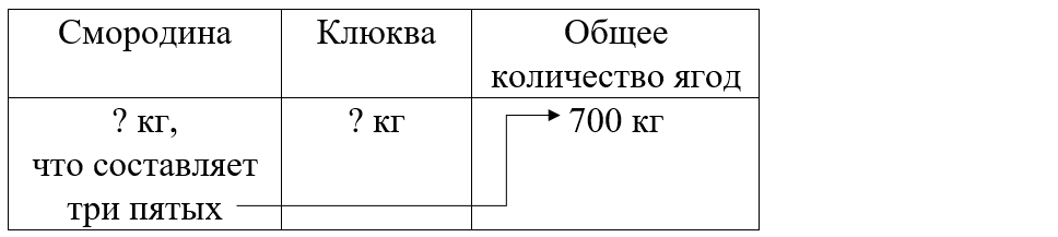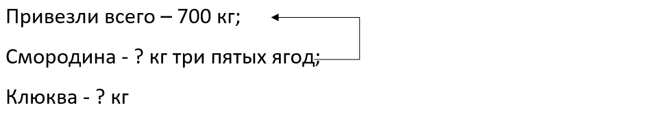 Краткое условие: В магазин привезли всего 700 кг ягод, из них три пятых — смородина. Сколько килограммов клюквы привезли?
